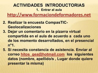 Este documento presenta las actividades de un módulo sobre Google Maps de un curso de ciencias sociales sobre geolocalización. Instruye a los estudiantes sobre cómo usar Google Maps y Google Earth para crear y compartir mapas colaborativos, agregar datos y marcadores, y transferir información entre las plataformas. El objetivo es aplicar una secuencia didáctica al trabajo en equipo mediante el uso de herramientas digitales.