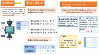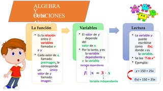 El documento describe la relación entre las variables dependientes e independientes a través de funciones matemáticas, presentando ejemplos de cómo representar funciones mediante expresiones algebraicas, tablas, diagramas y gráficos. Además, aborda el dominio y recorrido de funciones en contextos prácticos, como el cálculo de ingresos en un teatro y la proporcionalidad en el tamaño de letras proyectadas. Se discuten características de funciones lineales, crecientes y decrecientes, así como la forma de calcular pendientes y los conceptos de función afín.