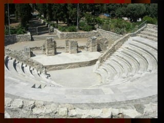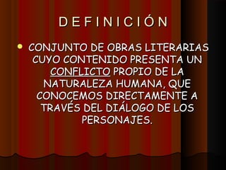 Este documento define los conceptos de obra dramática, obra teatral, drama, tragedia, comedia y describe los orígenes del teatro en la antigua Grecia. Explica que una obra dramática es un texto escrito por un dramaturgo, mientras que una obra teatral es su representación en un escenario dirigida por un director. Asimismo, detalla las características de la estructura y organización de un texto dramático.