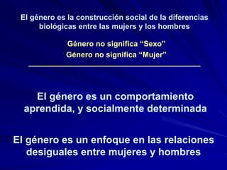 Este documento describe la perspectiva de género y la equidad de género en salud. Explica que el género es una construcción social basada en las diferencias biológicas entre mujeres y hombres. Lograr la equidad de género en salud implica eliminar las desigualdades innecesarias entre mujeres y hombres en términos de riesgos de salud, acceso a recursos de salud y participación en el sector salud.