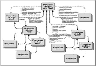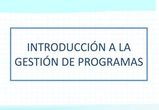 Este documento proporciona una introducción a la gestión de programas. Explica que un programa es un grupo de proyectos relacionados que se gestionan de forma coordinada para obtener beneficios. Describe los procesos clave de la gestión de programas como el desarrollo del plan de gestión del programa, la gestión de la ejecución del programa y el monitoreo y control de la performance del programa. También cubre temas como la oficina de gestión de programas, el ciclo de vida del programa y la gestión de beneficios.