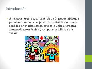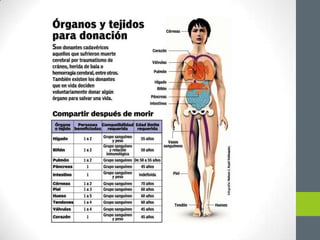 Este documento resume la donación y trasplante de órganos. Explica que los órganos pueden donarse de personas vivas o fallecidas con muerte cerebral. Las personas que pueden recibir un trasplante son aquellas con insuficiencia de órganos vitales como riñón o hígado. Aunque la donación salva vidas, existen riesgos como el tráfico ilegal de órganos. Se analizan modelos como el de España, que tiene altas tasas de donación, y se discute si debería hacerse