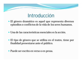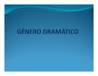 El documento describe el origen y las características del género dramático. Tuvo sus inicios en Grecia relacionado con el culto a Dionisio. Los autores más destacados fueron Terencio, Séneca y Plauto. Las principales divisiones del género son la tragedia, comedia y drama.