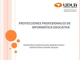 El documento presenta las proyecciones profesionales de informática educativa. Explica que las TIC son fundamentales en la sociedad actual y deben integrarse en la educación para facilitar aprendizajes significativos. Como futuros docentes, deben aprender a usar diferentes estrategias educativas con tecnología. La asignatura les enseña a incorporar las TIC de manera pedagógica y a actualizarse continuamente, trabajando en equipo y comunicando mediante blogs.