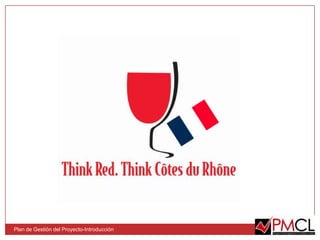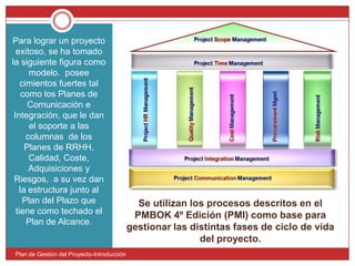El documento presenta un plan de gestión de proyecto para organizar la Exposición Universal del Vino 2012 en Avignon, Francia. Se utilizarán los procesos descritos en el PMBOK como base y se ha elegido un modelo con cimientos fuertes en planes de comunicación e integración que darán soporte a los planes de recursos humanos, calidad, costes, adquisiciones y riesgos, con un plan de alcance que estructura el proyecto y un plan de plazos como techado.