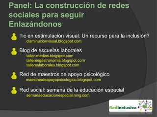 Este documento lista varios recursos en línea relacionados con la educación especial, incluyendo blogs, redes sociales y proyectos. Se mencionan talleres y capacitaciones sobre el uso de la tecnología y las redes sociales para promover la inclusión educativa. Finalmente, se discute el uso de la tecnología adaptativa para atender las necesidades individuales de los estudiantes.