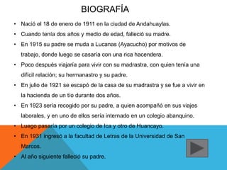 José María Arguedas fue un escritor peruano que nació en 1911 en Andahuaylas. Pasó su infancia y juventud mudándose entre diferentes ciudades y colegios debido al trabajo de su padre. Quedó huérfano a temprana edad y tuvo una difícil relación con su madrastra. Estudió letras en la Universidad de San Marcos. Es conocido por plasmar el universo quechua en sus cuentos y novelas de forma lírica, recuperando elementos mágicos de la cultura andina y mostrando el conflicto entre
