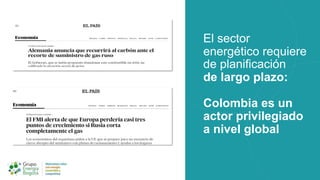 El documento presenta los resultados de una encuesta realizada en Colombia sobre percepciones en torno al cambio climático, la transición energética y las tarifas. La mayoría de los encuestados no conocen estos temas o las metas del gobierno. Consideran que el gas natural es más económico que otras opciones y juega un papel importante. Se necesita educar a la población sobre estos asuntos y garantizar la participación comunitaria en las decisiones que los afectan.
