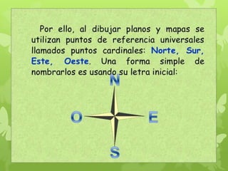 El documento describe los puntos cardinales y cómo se utilizan la brújula y la veleta para determinar la ubicación. Explica que la salida y puesta del sol permitió al hombre crear los puntos cardinales y lista los puntos intermedios como el noroeste, noreste, suroeste y sureste. Además, proporciona un ejemplo de cómo simular una rosa de los vientos usando nuestro cuerpo.