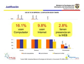 El documento describe el proyecto Mipyme Digital de Colombia, el cual tiene como objetivo promover el uso de las tecnologías de la información y la comunicación (TIC) entre las micro, pequeñas y medianas empresas colombianas. El proyecto opera a través de convocatorias en las que proveedores de TIC ofrecen soluciones tecnológicas a empresas beneficiarias de diferentes sectores económicos. El documento también discute la distribución de riesgos en los contratos estatales según la ley colombiana y analiza posibles ries