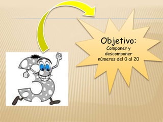 El documento presenta una actividad para que los estudiantes aprendan a componer y descomponer números del 0 al 100 de forma aditiva a través de ejemplos concretos, pictóricos y simbólicos. Los estudiantes deben descomponer números como 16, 10, 12, 17 y 20 usando sumas.