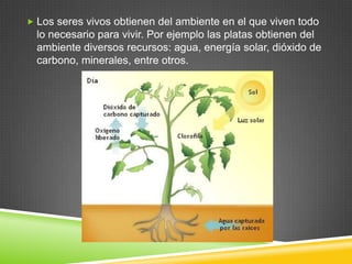 El documento describe las relaciones de dependencia entre los seres vivos y su ambiente. Las plantas y animales obtienen de su medio recursos vitales como agua, luz y minerales. El documento luego se enfoca en las adaptaciones de las plantas al agua y la luz, incluyendo ejemplos como raíces profundas en zonas áridas y orientación hacia el sol. Finalmente, menciona que los animales también requieren adaptaciones específicas para alimentarse, desplazarse y protegerse.