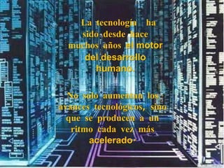 El documento discute cómo la tecnología ha beneficiado principalmente a las minorías ricas y cómo se han creado brechas digitales entre países ricos y pobres y dentro de los propios países. Aunque existen programas de inclusión tecnológica, es necesario acompañarlos de educación, ya que hay lugares donde palabras básicas de tecnología son desconocidas. Se necesitan políticas a nivel nacional e internacional para orientar las nuevas tecnologías hacia las necesidades más urgentes y reducir las brechas digitales de acceso,