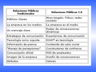 El documento habla sobre las nuevas tecnologías de la Web 2.0 como las redes sociales, blogs y wikis que fomentan la colaboración entre usuarios. Describe características clave de la Web 2.0 como permitir que los usuarios controlen sus datos y usar estándares como XHTML. También menciona cómo estas tecnologías están transformando las relaciones públicas al permitir nuevos canales de comunicación y participación de empleados y clientes.