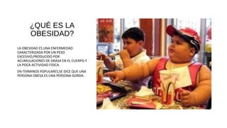 El documento habla sobre la obesidad como una enfermedad causada por el consumo excesivo y la inactividad física. Explica que la obesidad aumenta el riesgo de varias enfermedades como la hipertensión, diabetes y problemas cardíacos. Recomienda controlar el peso mediante cambios en los hábitos alimenticios y de ejercicio, siguiendo un plan nutricional y controlando regularmente el peso.