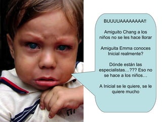El documento critica al Ministerio de Educación por la falta de calidad educativa en los programas iniciales, señalando que no se trata bien a los niños y faltan especialistas. Se pide una respuesta sobre por qué se agrede a los niños pequeños y no se les brinda el cuidado y educación adecuados en esta etapa.