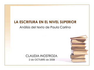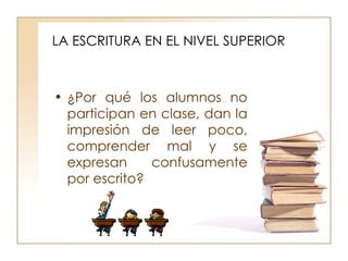El documento discute las dificultades que enfrentan los estudiantes universitarios con respecto a la lectura y escritura, y propone incluir más actividades de lectura y escritura en los cursos para mejorar el aprendizaje. Explica que la lectura y escritura son centrales en la universidad pero no reciben suficiente atención. También describe cómo la escritura puede estimular el pensamiento crítico y la generación de nuevas ideas, y sugiere algunas actividades como síntesis y tutorías para potenciar estas habilidades.