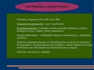 El documento describe el arte prehistórico europeo, incluyendo el arte paleolítico, las escuelas franco-cantábrica y del sur de la península ibérica, el arte mobiliario como las venus paleolíticas, la escuela levantina postpaleolítica, el megalitismo y la cultura balear. Explica las características, cronología e interpretaciones simbólicas de estas manifestaciones artísticas prehistóricas.