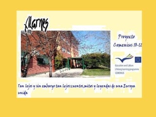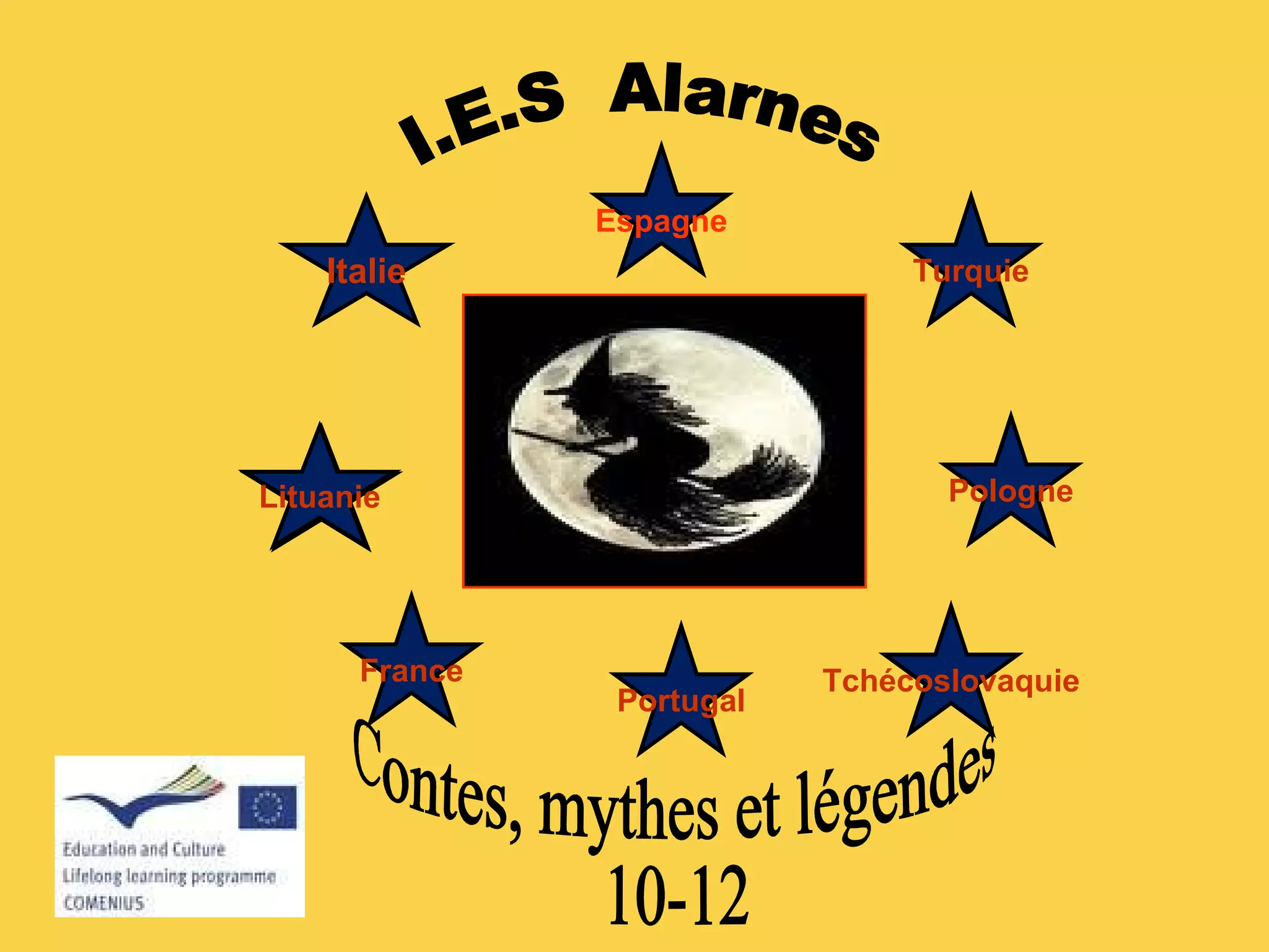 Este documento presenta un proyecto educativo entre ocho institutos de educación secundaria de varios países europeos llamado IES Alarnes. El proyecto tiene como objetivos aumentar la motivación de los estudiantes para aprender idiomas extranjeros, promover la cooperación europea entre estudiantes y profesores, y experimentar la idea de ciudadanía europea. A lo largo de dos años, los estudiantes trabajarán en torno a temas comunes como mitos, leyendas y cuentos tradicionales de sus países respectivos.