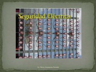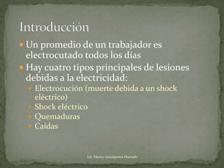 El documento resume los principales riesgos eléctricos en el trabajo y las medidas de protección. Explica que un promedio de un trabajador es electrocutado diariamente y describe cuatro tipos comunes de lesiones eléctricas. Además, destaca conceptos eléctricos básicos como corriente, resistencia y voltaje, y requisitos de seguridad de OSHA como conexiones a tierra adecuadas y el uso de interruptores de circuito de falla a tierra.