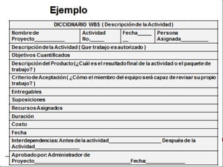 Este documento presenta información sobre la gestión del alcance de proyectos. Brevemente describe tres procesos clave para la gestión del alcance: 1) Recopilar requisitos, que implica definir y documentar las necesidades de los interesados; 2) Definición del alcance, que consiste en desarrollar una descripción detallada del proyecto y producto; y 3) Crear el WBS (estructura de desglose de trabajo), que subdivide los entregables y trabajo del proyecto en componentes más pequeños. El documento ofrece inform