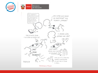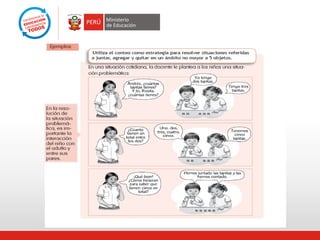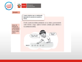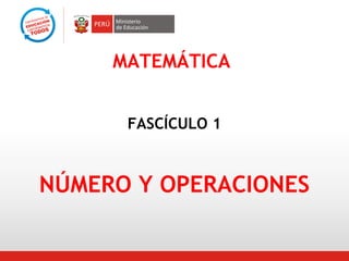Este documento presenta el fascículo 1 sobre números y operaciones emitido por el MED para apoyar la enseñanza de matemáticas. Explica que solo el 13% de estudiantes peruanos alcanzan los aprendizajes básicos de números, por lo que propone abordarlos de forma gradual y significativa usando material concreto y juegos. El fascículo presenta cuatro secciones para guiar los aprendizajes esperados en niños de 5 años y los primeros grados, así como sugerencias de evaluación.