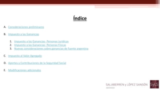 El documento resume los principales cambios propuestos en el Proyecto de Reforma Tributaria argentino, incluyendo la reducción gradual de la alícuota del impuesto a las ganancias corporativas del 35% al 25%, la eliminación de exenciones impositivas sobre ganancias financieras de personas físicas, y la ampliación de la base imponible para aportes a la seguridad social. También propone gravar plataformas digitales y operaciones criptográficas.