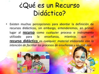 Este documento describe PowerPoint como un software multimedia que puede ser utilizado como recurso didáctico debido a sus capacidades de animación, sonido y colores. Explica que un recurso didáctico es cualquier material creado para facilitar la enseñanza y el aprendizaje, e incluye consejos sobre el uso adecuado de texto, imágenes, animación, fondos, sonido y video en PowerPoint para crear un recurso didáctico efectivo.