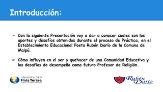 El documento presenta los aportes y desafíos obtenidos por un estudiante durante su práctica en un colegio. Entre los aportes se encuentran conocer realidades distintas a su entendimiento previo de la educación, aprender a valorar las capacidades de todos los estudiantes y estar atento a sus problemáticas. Los desafíos a futuro incluyen aceptar la incertidumbre, entregar una formación sólida en valores y comprender los cambios del mundo actual.