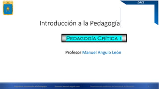 El documento presenta información sobre diferentes teóricos de la pedagogía crítica como Paulo Freire, Stephen Kemmis, Henry Giroux y Peter McLaren. Se describe a Peter McLaren como uno de los fundadores de la pedagogía crítica que ha realizado análisis políticos influenciado por el marxismo humanista. También se brindan detalles sobre las contribuciones de Henry Giroux a la teoría crítica y su oposición a tendencias antidemocráticas. Finalmente, se explican algunos principios fundamentales de la pedagogía
