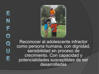 Este documento describe las estrategias y programas de intervención del Servicio de Orientación al Adolescente para promover la reinserción social de adolescentes en conflicto con la ley penal. El enfoque pedagógico del programa favorece conductas más responsables a través de personal capacitado, ambientes acogedores, actividades lúdicas y la participación de la familia. Los resultados muestran que el 70% de los adolescentes se becaron y el 25 de 30 presentaron nivel de reinserción positiva en 2006, además de capacitar a 620 padres al a