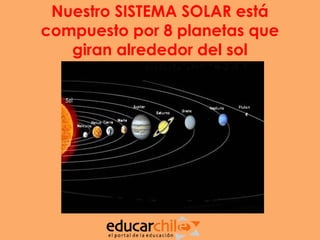 El Sistema Solar está compuesto por 8 planetas que giran alrededor del Sol, la principal fuente de energía. Los planetas, ordenados desde el más cercano al Sol, son Mercurio, Venus, la Tierra, Marte, Júpiter, Saturno, Urano y Neptuno. Cada planeta tiene características únicas como su tamaño, composición y lunas.