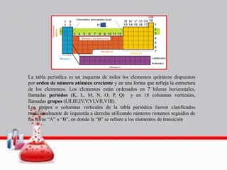 La tabla periódica es un esquema que ordena los 118 elementos químicos conocidos por su número atómico y propiedades periódicas. Los elementos se organizan en 7 períodos horizontales y 18 grupos verticales, donde los grupos muestran tendencias en la valencia y las propiedades de los elementos. La tabla ilustra cómo los electrones se agregan a las capas electrónicas a medida que aumenta el número atómico de un elemento.