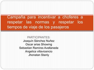 Este proyecto busca incentivar a los choferes a respetar los tiempos de viaje de los pasajeros mediante el uso de una caja con alarma. El grupo desarrolló una caja que sonará después de 5 minutos en el paradero para llamar la atención del chofer y motivarlo a avanzar. La mayoría de personas aprobaron la idea porque cree que será efectiva para reducir el tiempo perdido. Sin embargo, también incomodó a algunos pasajeros y choferes lo tomaron como broma.
