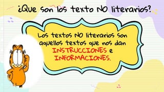 Los textos no literarios proporcionan instrucciones e información a través de formatos como cartas, biografías, recetas y textos informativos. Estos textos buscan educar o informar al lector sobre un tema en particular en lugar de entretenerlo.