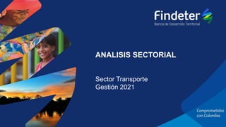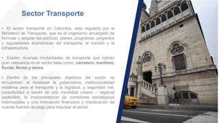 El documento describe el sector de transporte en Colombia. Está regulado por el Ministerio de Transporte y comprende diversas modalidades como carretera, marítima, fluvial, férrea y aérea. Sus objetivos incluyen fortalecer la gobernanza, conectividad urbano-regional sostenible e implementar corredores estratégicos intermodales. Más de la mitad de las inversiones se han destinado a Antioquia, Bogotá y Atlántico, principalmente al subsector de transporte vial. Se destaca la importancia de invertir en infra