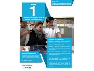 Este documento describe la estructura de la Unidad 1 de un curso sobre diseño curricular y teoría del conocimiento para la educación técnico profesional. La unidad se divide en tres semanas y analiza los componentes de las bases curriculares y los planes de estudio, así como la didáctica en la educación técnico profesional y su enfoque en el aprendizaje de los estudiantes.