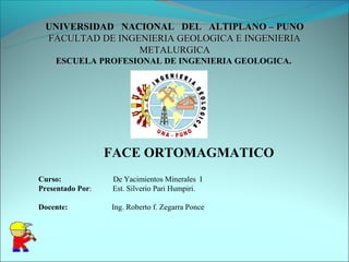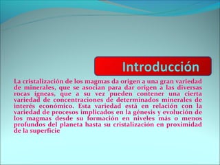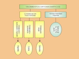 Este documento resume los procesos magmáticos y yacimientos minerales asociados a rocas ígneas. Explica que durante la cristalización de magmas se forman una variedad de minerales que dan lugar a diversas rocas ígneas, algunas de las cuales contienen concentraciones de minerales de interés económico. Describe procesos como la cristalización fraccionada, líquidos inmiscibles y segregación magmática, los cuales pueden dar lugar a yacimientos de cromita, sulfuros