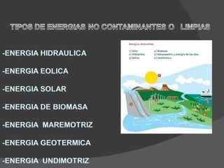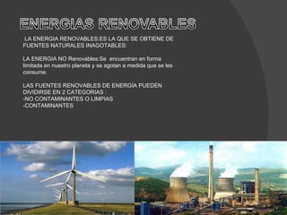 El documento resume las diferentes fuentes de energía renovables y no renovables. Las energías renovables incluyen la hidráulica, solar, eólica, geotérmica, de las olas y la biomasa, las cuales se obtienen de fuentes naturales inagotables. Las no renovables son los combustibles fósiles como el carbón, petróleo y gas natural, y también los combustibles nucleares como el uranio, los cuales se agotan con el uso.
