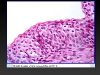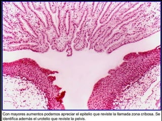 Este documento describe la histología de los conductos excretores del sistema urinario, incluyendo la pelvis renal, los ureteres, la vejiga y la uretra. Estos conductos están revestidos por urotelio, un epitelio de transición en capas de 3-6 células. La pelvis renal y los ureteres tienen una lámina propia y una capa muscular delgada, mientras que la vejiga tiene capas musculares más gruesas que se distienden cuando se llena. La uretra está revestida por epitelio columnar
