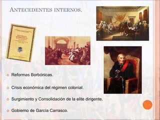 El documento describe los antecedentes internos y externos que llevaron a la independencia de Chile, incluyendo las reformas borbónicas, la crisis económica, y la influencia de la Revolución Francesa. También presenta a varios personajes importantes en el proceso de independencia como Mateo de Toro Zambrano, Manuel Rodríguez, José Miguel Carrera y Bernardo O'Higgins.