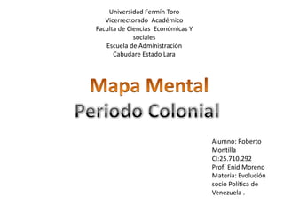 La época colonial en Venezuela se caracterizó por el dominio político y económico del gobierno español sobre el territorio venezolano desde el siglo XVI hasta principios del XIX. El país estaba organizado en una Capitanía General de Venezuela integrada por varias provincias y gobernada por un Capitán General designado por la corona española. El cabildo jugó un papel importante como organización municipal y en el surgimiento de los movimientos de independencia ante el descontento con el sistema colonial.
