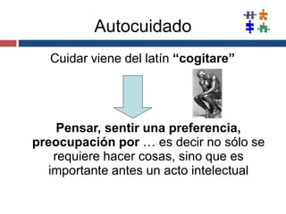 1) El autocuidado se refiere a las prácticas cotidianas y decisiones que toma una persona para cuidar su salud, como parte de un proceso de aprendizaje a lo largo de la vida.