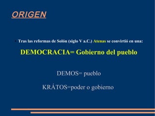 La democracia se originó en la antigua Grecia en Atenas tras las reformas de Solón en el siglo V a.C., estableciéndose como un gobierno del pueblo. La asamblea ateniense votaba las leyes y decisiones importantes, mientras que los magistrados como los estrategas y arcontes se encargaban de los asuntos públicos. Aunque la democracia ateniense permitía una participación directa de los ciudadanos, excluía a mujeres, extranjeros y esclavos de la toma de decisiones.