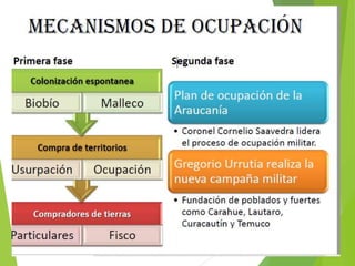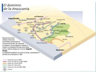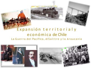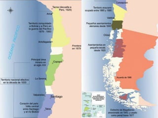 1) El documento describe la expansión territorial y económica de Chile en el siglo XIX, incluyendo la Guerra del Pacífico, el auge de la industria salitrera, y la incorporación de la Araucanía.