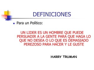 DEFINICIONES  Para unPolítico: UN LIDER ES UN HOMBRE QUE PUEDE PERSUADIR A LA GENTE PARA QUE HAGA LO QUE NO DESEA O LO QUE ES DEMASIADO PEREZOSO PARA HACER Y LE GUSTE HARRY TRUMAN