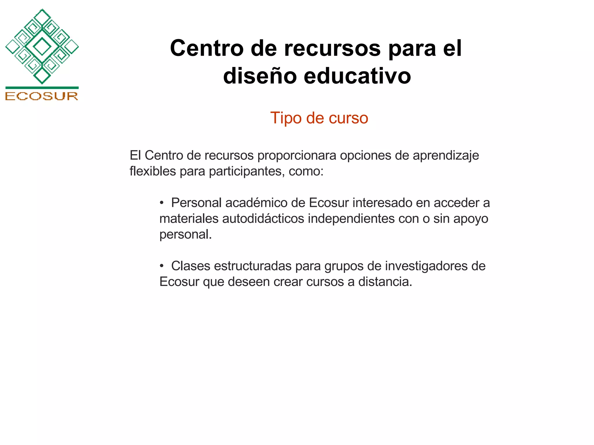 Este documento describe un centro de recursos que proporcionará opciones de aprendizaje flexibles para el personal académico de Ecosur, incluidos materiales autodidácticos y clases estructuradas. El centro está diseñado para apoyar las necesidades pedagógicas de los instructores de Ecosur. Los objetivos incluyen fomentar la colaboración entre investigadores, ampliar el uso del conocimiento de Ecosur e impulsar la innovación educativa. La duración de los cursos será flexible dependiendo de las necesidades de cada alumn