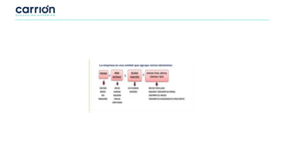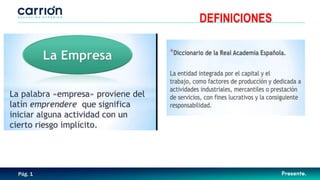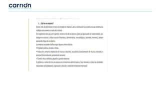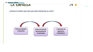 El documento define las características de las empresas, incluyendo que persiguen un fin económico, crean bienes y servicios para satisfacer las necesidades de la sociedad, asumen riesgos y contribuyen al desarrollo de la comunidad. También describe las áreas funcionales clave de una empresa como dirección, recursos humanos, finanzas, contabilidad, marketing y ventas. Además, explica los elementos clave de la filosofía empresarial como la misión, la visión y los valores.