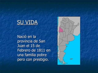 Domingo Faustino Sarmiento nació en 1811 en San Juan, Argentina. Se destacó como maestro, periodista, escritor, gobernador y presidente de Argentina entre 1868 y 1874. Impulsó la educación pública obligatoria y fundó cientos de escuelas para promover la instrucción del pueblo, creyendo que esto fortalecería la democracia. Murió en 1888, dejando una importante obra literaria y siendo recordado como el padre de la educación argentina.