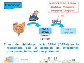 Este documento resume un estudio sobre la incidencia de infecciones del tracto urinario (ITU) en pacientes tratados con inhibidores de la DPP-4 (IDPP-4). El estudio encontró que el 9% de los pacientes tratados con gliptinas desarrollaron una ITU en un año, una proporción mayor que la reportada previamente. Aunque las gliptinas pueden contribuir a las ITU, también es posible que haya una relación entre la diabetes y las infecciones. Los médicos deben comunicar los posibles efectos adversos de los nuevos